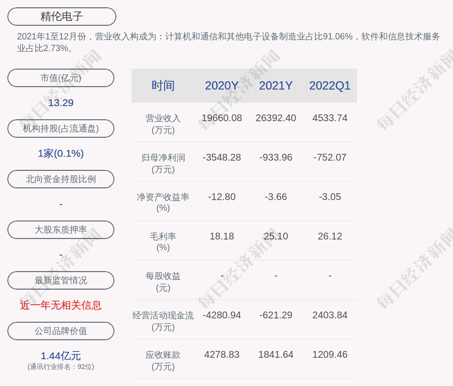 2021年1至12月份,精伦电子的营业收入构成为:计算机和通信和其他电子设备制造业占比91.06%,软件和信息技术服务业占比2.73%。