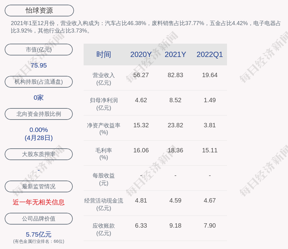 2021年1至12月份,怡球资源的营业收入构成为:汽车占比46.38%,废料销售占比37.77%,五金占比4.42%,电子电器占比3.92%,其他行业占比3.73%。