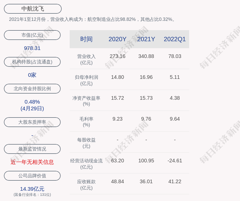 每经AI快讯,中航沈飞(SH 600760,收盘价:49.9元)4月30日发布一季度业绩公告称,2022年第一季度营收约78.03亿元;归属于上市公司股东的净利润约5.11亿元;基本每股收益0.26元。