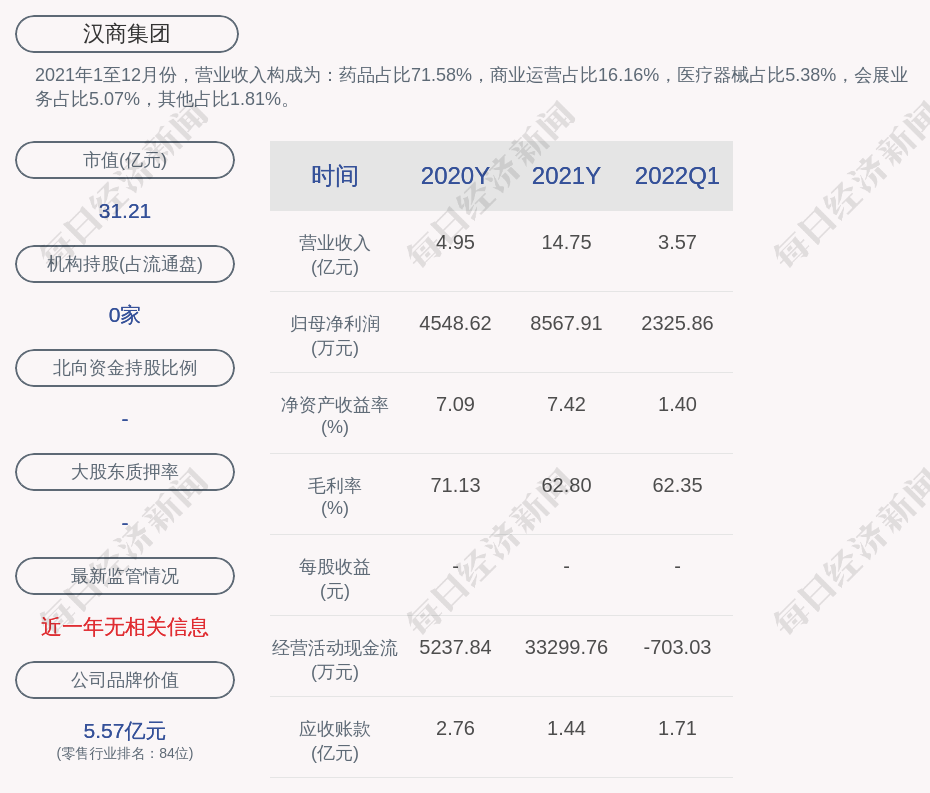 2021年1至12月份,汉商集团的营业收入构成为:药品占比71.58%,商业运营占比16.16%,医疗器械占比5.38%,会展业务占比5.07%,其他占比1.81%。