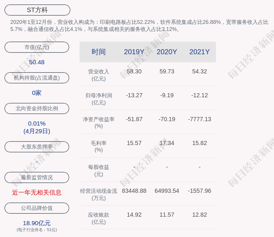 2020年1至12月份,ST方科的营业收入构成为:印刷电路板占比52.22%,软件系统集成占比26.88%,宽带服务收入占比5.7%,融合通信收入占比4.1%,与系统集成相关的服务收入占比3.12%。