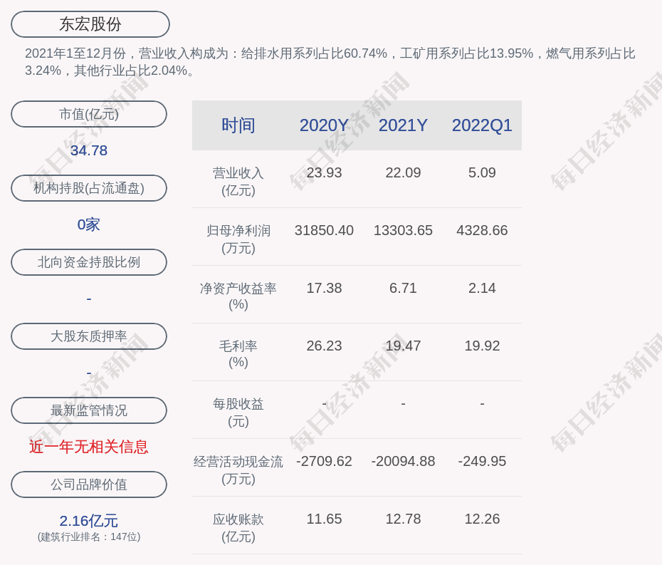 2021年1至12月份,东宏股份的营业收入构成为:给排水用系列占比60.74%,工矿用系列占比13.95%,燃气用系列占比3.24%,其他行业占比2.04%。