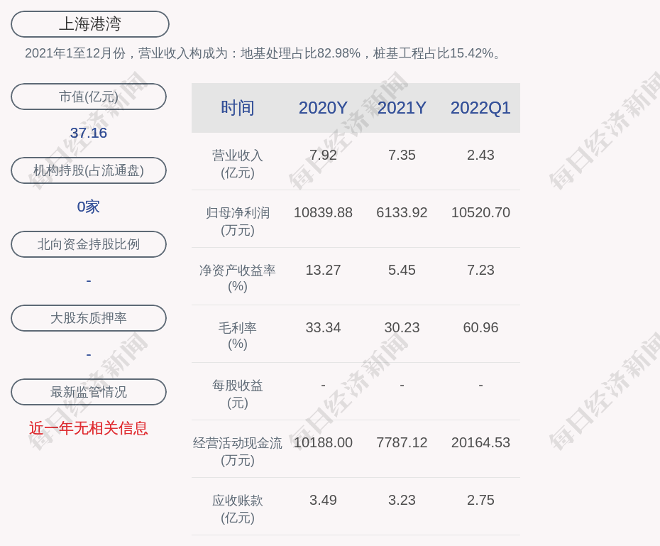 每经AI快讯,上海港湾(SH 605598,收盘价:21.51元)4月30日发布一季度业绩公告称,2022年第一季度营收约2.43亿元;归属于上市公司股东的净利润约1.05亿元。