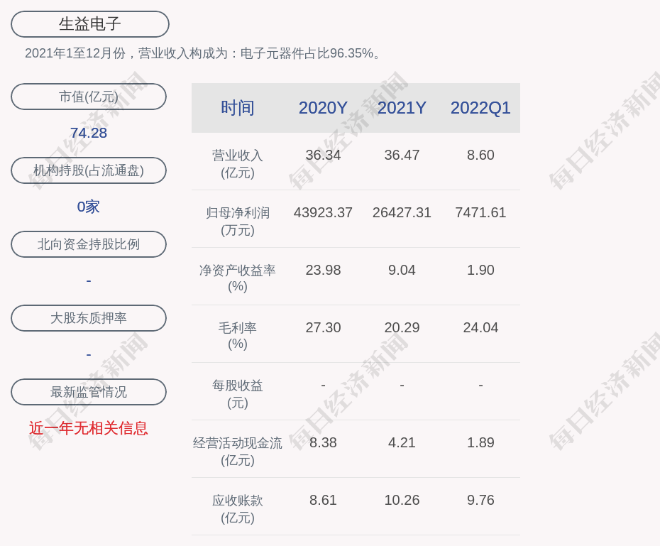 每经AI快讯,生益电子(SH 688183,收盘价:8.93元)4月30日发布一季度业绩公告称,2022年第一季度营收约8.6亿元;归属于上市公司股东的净利润约7472万元;基本每股收益0.09元。