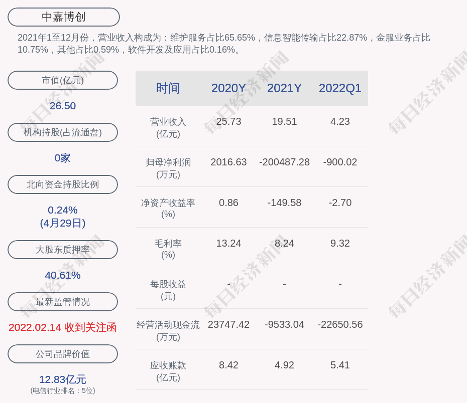 2021年1至12月份,中嘉博创的营业收入构成为:维护服务占比65.65%,信息智能传输占比22.87%,金服业务占比10.75%,其他占比0.59%,软件开发及应用占比0.16%。