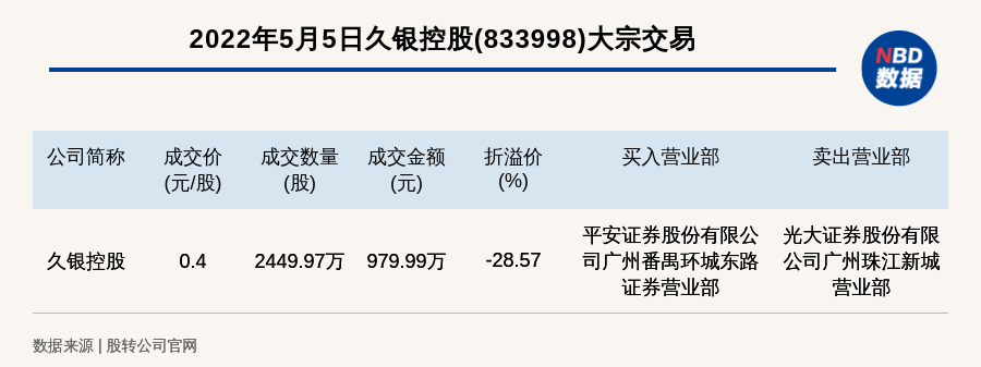 每经讯,2022年5月5日,新三板基础层公司久银控股(833998)发生一笔大宗交易,成交价0.4元/股,成交数量2449.97万股,成交金额979.99万元,折价28.57%。买入营业部是平安证券股份有限公司广州番禺环城东路证券营业部,卖出营业部是光大证券股份有限公司广州珠江新城营业部。