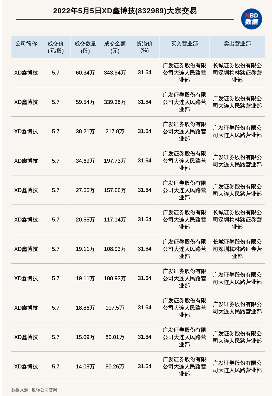 每经讯,2022年5月5日,新三板基础层公司XD鑫博技(832989)发生11笔大宗交易,总成交金额为1865.27万元,成交金额最高的一笔成交价5.7元/股,成交数量60.34万股,成交金额343.94万元,溢价31.64%。买入营业部是广发证券股份有限公司大连人民路营业部,卖出营业部是长城证券股份有限公司深圳梅林路证券营业部。