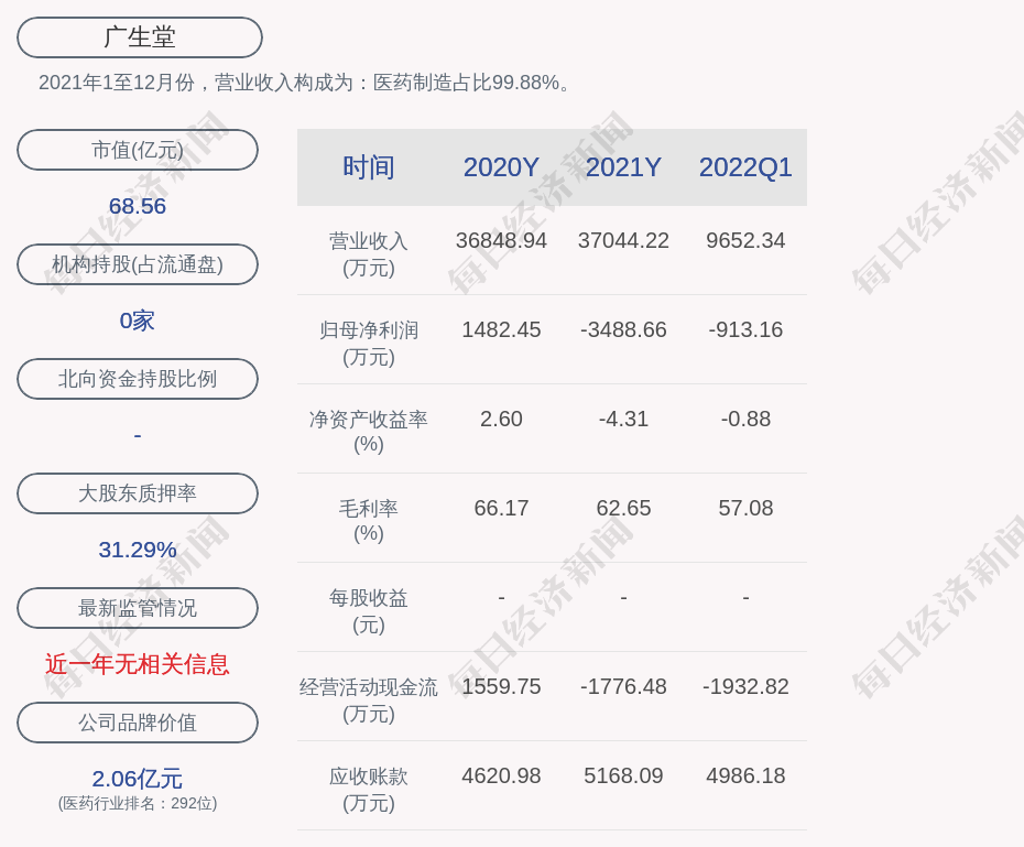 2021年1至12月份,广生堂的营业收入构成为:医药制造占比99.88%。
