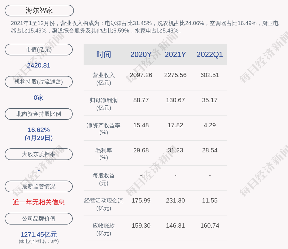 2021年1至12月份,海尔智家的营业收入构成为:电冰箱占比31.45%,洗衣机占比24.06%,空调器占比16.49%,厨卫电器占比15.49%,渠道综合服务及其他占比6.59%,水家电占比5.48%。