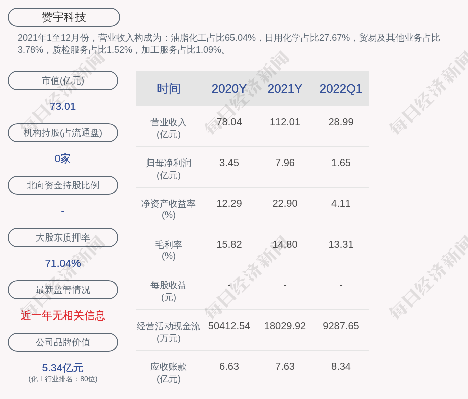 2021年1至12月份,赞宇科技的营业收入构成为:油脂化工占比65.04%,日用化学占比27.67%,贸易及其他业务占比3.78%,质检服务占比1.52%,加工服务占比1.09%。