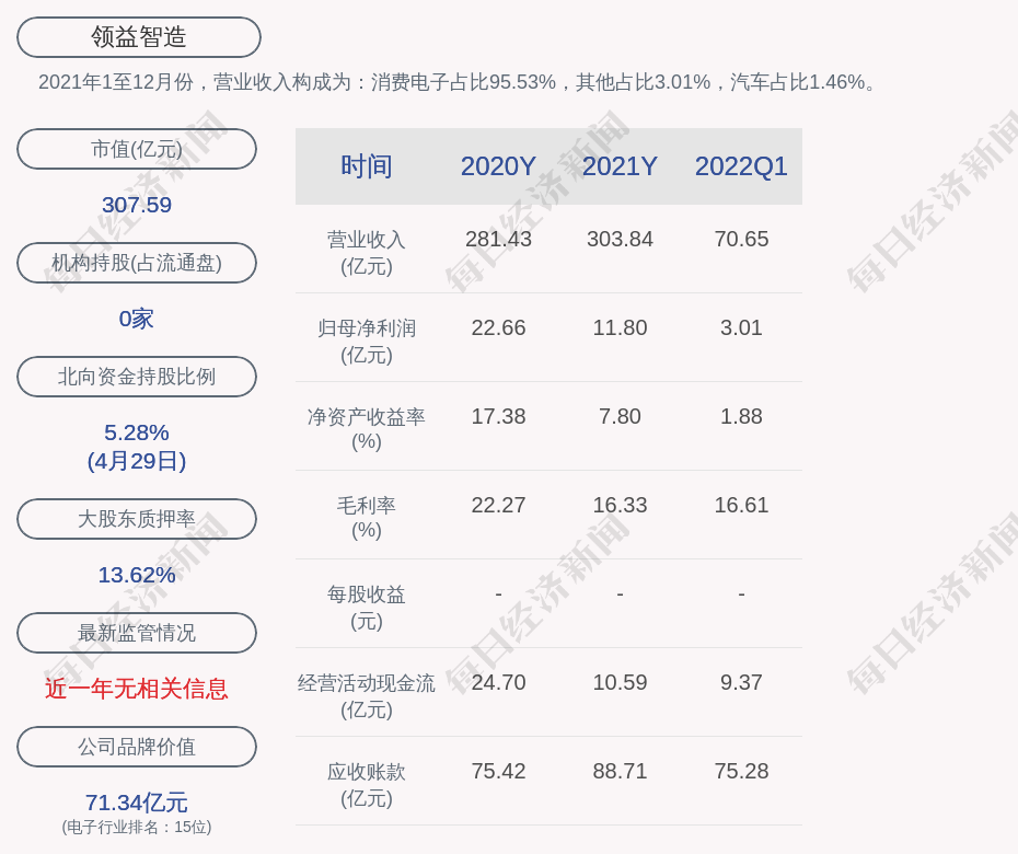 2021年1至12月份,领益智造的营业收入构成为:消费电子占比95.53%,其他占比3.01%,汽车占比1.46%。