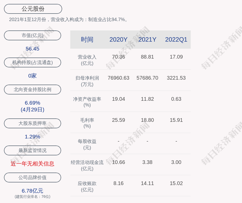 2021年1至12月份,公元股份的营业收入构成为:制造业占比94.7%。