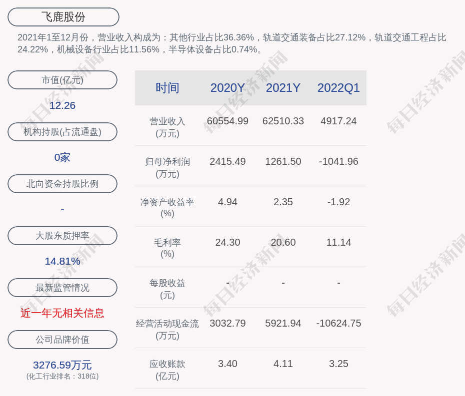 2021年1至12月份,飞鹿股份的营业收入构成为:其他行业占比36.36%,轨道交通装备占比27.12%,轨道交通工程占比24.22%,机械设备行业占比11.56%,半导体设备占比0.74%。