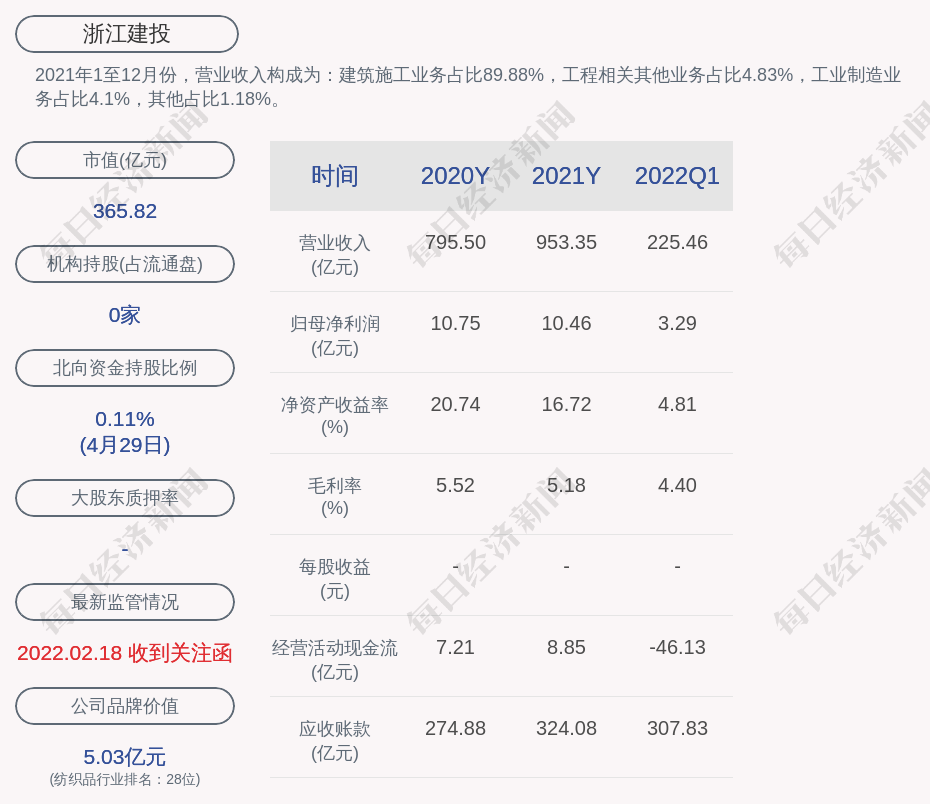 2021年1至12月份,浙江建投的营业收入构成为:建筑施工业务占比89.88%,工程相关其他业务占比4.83%,工业制造业务占比4.1%,其他占比1.18%。