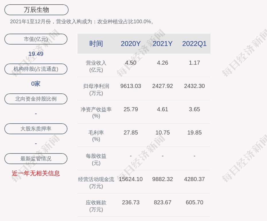 2021年1至12月份,万辰生物的营业收入构成为:农业种植业占比100.0%。
