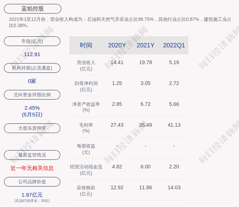 2021年1至12月份,蓝焰控股的营业收入构成为:石油和天然气开采业占比98.75%,其他行业占比0.87%,建筑施工业占比0.38%。