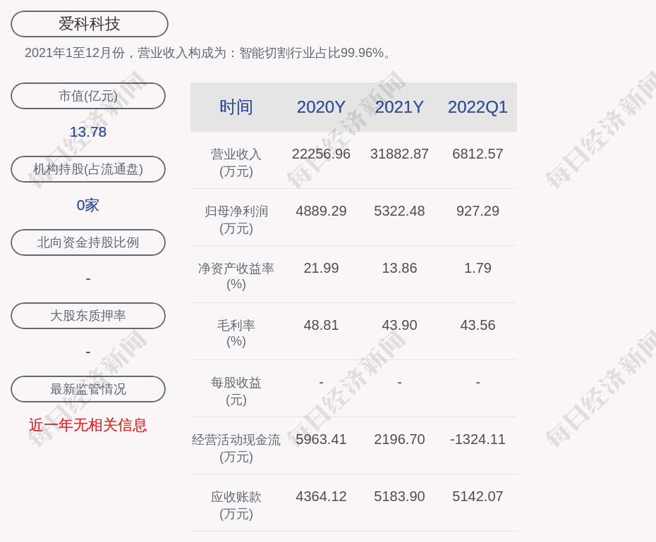 2021年1至12月份,爱科科技的营业收入构成为:智能切割行业占比99.96%。