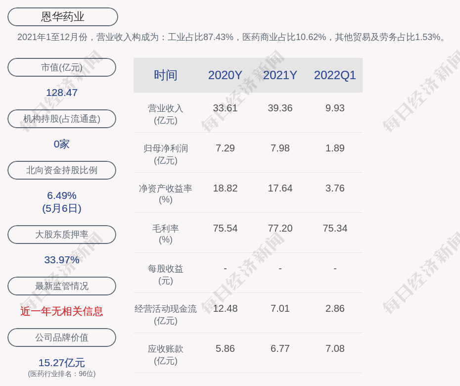 1. 恩华药业近30日内北向资金持股量减少1409.60万股,占流通股比例减少1.59%;