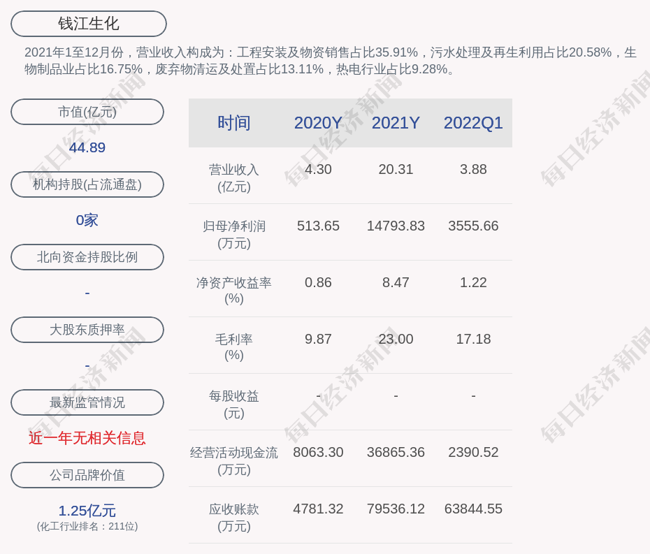 2021年1至12月份,钱江生化的营业收入构成为:工程安装及物资销售占比35.91%,污水处理及再生利用占比20.58%,生物制品业占比16.75%,废弃物清运及处置占比13.11%,热电行业占比9.28%。