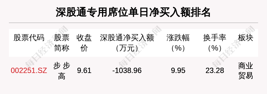 在龙虎榜中,涉及深股通专用席位的个股有1只,步 步 高的深股通专用席位净卖出额最大,净卖出1038.96万元。