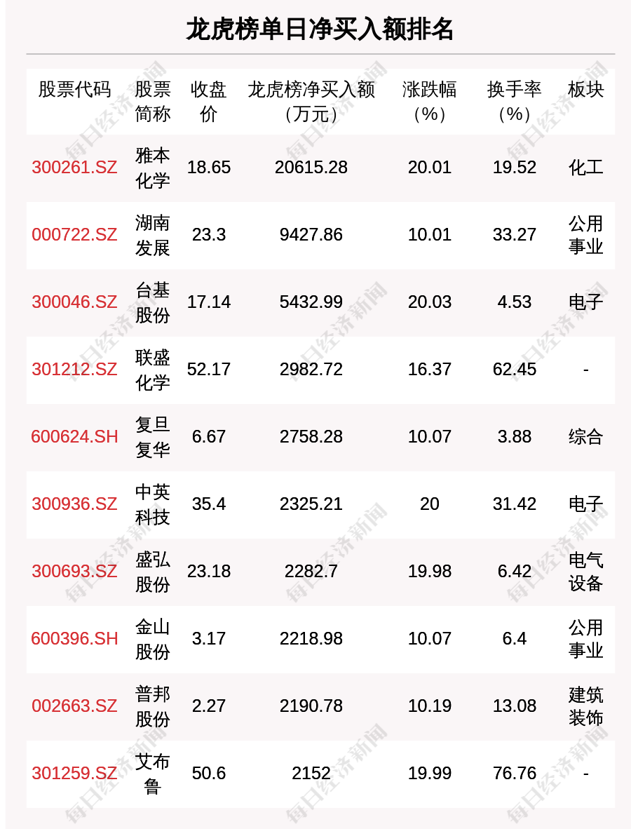 每经AI快讯,5月11日,共有50只个股上榜龙虎榜,雅本化学龙虎榜单日净买入额最多,达2.06亿元。