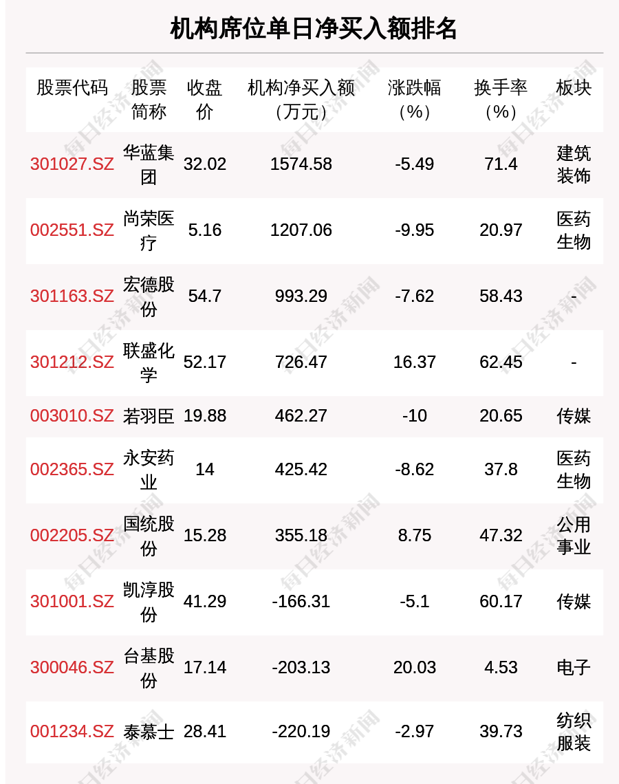 在龙虎榜中,涉及机构专用席位的个股有14只,净买入额前三的是华蓝集团、尚荣医疗、宏德股份,分别为1574.58万元、1207.06万元、993.29万元。