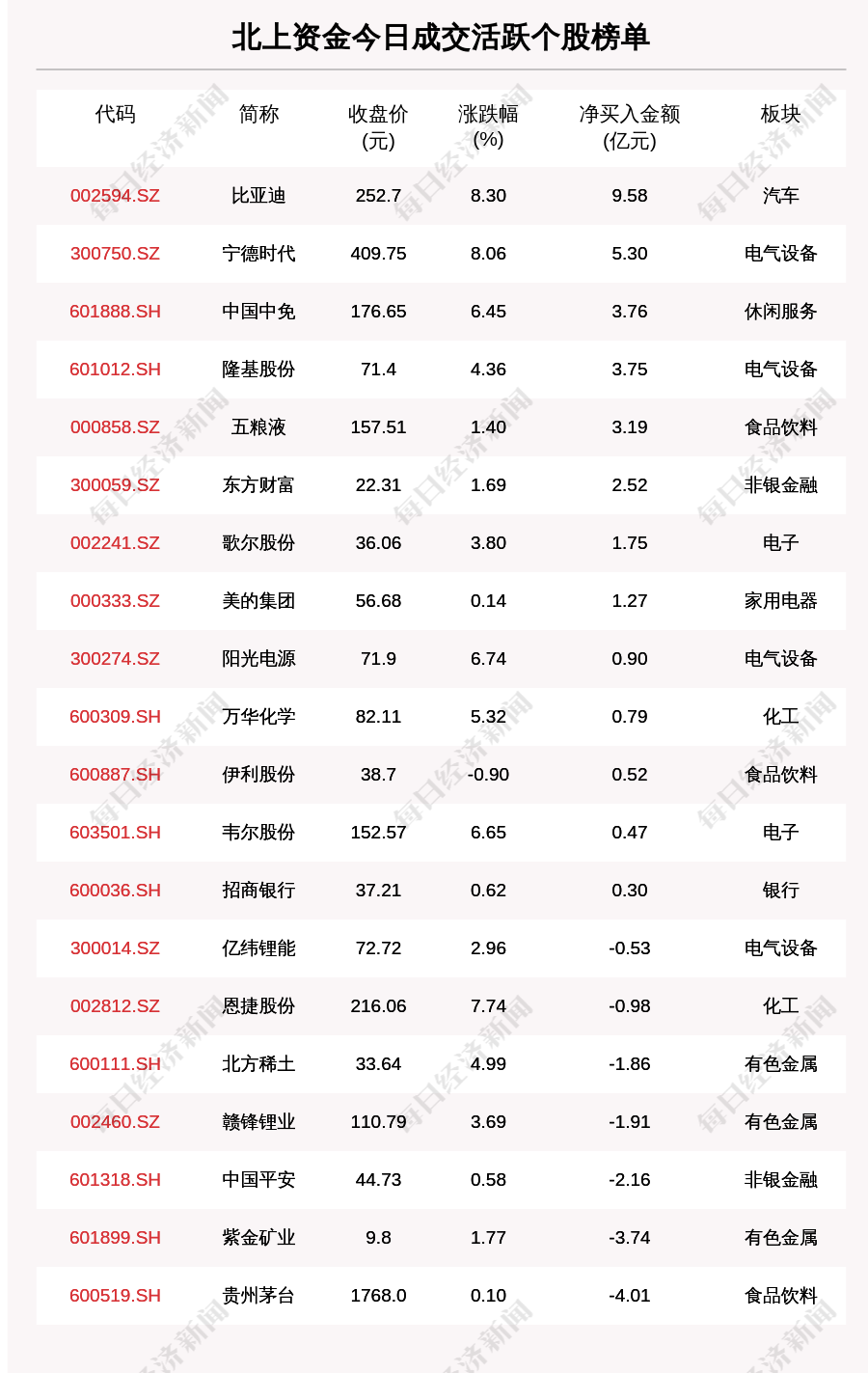 5月11日,北上资金成交活跃个股榜单中,净买入个股共13只,金额最多的是比亚迪(002594.SZ,收盘价:252.7元),净买入9.581亿元;净卖出个股共7只,金额最多的是贵州茅台(600519.SH,收盘价:1768.0元),净卖出4.014亿元。