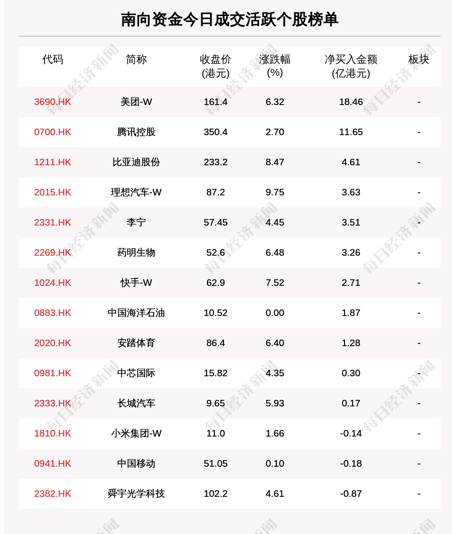 南向资金成交活跃个股榜单中,净买入个股共11只,金额最多的是美团-W(3690.HK,收盘价:161.4港元),净买入18.460亿港元;净卖出个股共3只,金额最多的是舜宇光学科技(2382.HK,收盘价:102.2港元),净卖出0.874亿港元。