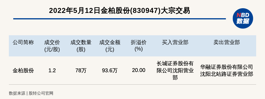 每经讯,2022年5月12日,新三板基础层公司金柏股份(830947)发生一笔大宗交易,成交价1.2元/股,成交数量78万股,成交金额93.6万元,溢价20%。买入营业部是长城证券股份有限公司沈阳营业部,卖出营业部是华融证券股份有限公司沈阳北站路证券营业部。