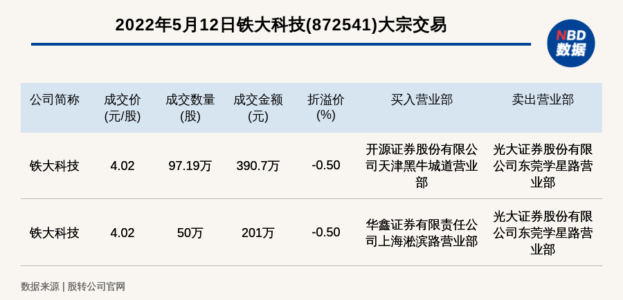 每经讯,2022年5月12日,新三板基础层公司铁大科技(872541)发生2笔大宗交易,总成交金额为591.7万元,成交金额最高的一笔成交价4.02元/股,成交数量97.19万股,成交金额390.7万元,折价0.5%。买入营业部是开源证券股份有限公司天津黑牛城道营业部,卖出营业部是光大证券股份有限公司东莞学星路营业部。