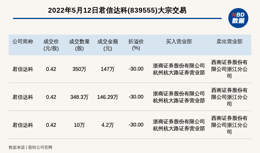 每经讯,2022年5月12日,新三板基础层公司君信达科(839555)发生3笔大宗交易,总成交金额为297.49万元,成交金额最高的一笔成交价0.42元/股,成交数量350万股,成交金额147万元,折价30%。买入营业部是浙商证券股份有限公司杭州杭大路证券营业部,卖出营业部是西南证券股份有限公司浙江分公司。