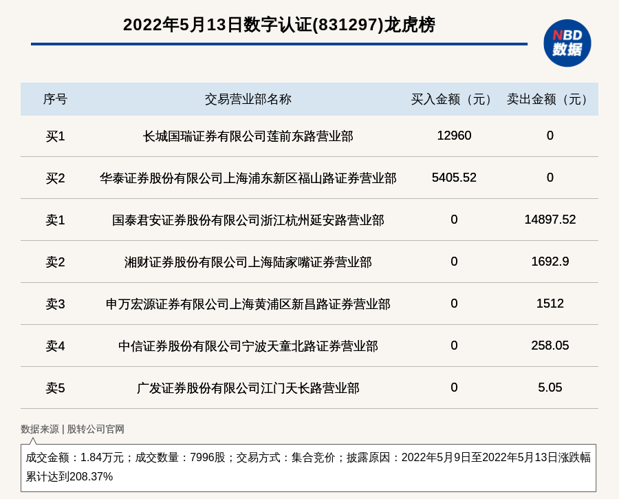 每经讯,2022年5月13日,新三板基础层公司数字认证(831297)登上龙虎榜,交易方式是集合竞价,披露原因是2022年5月9日至2022年5月13日涨跌幅累计达到208.37%,成交数量7996股,成交金额1.84万元。