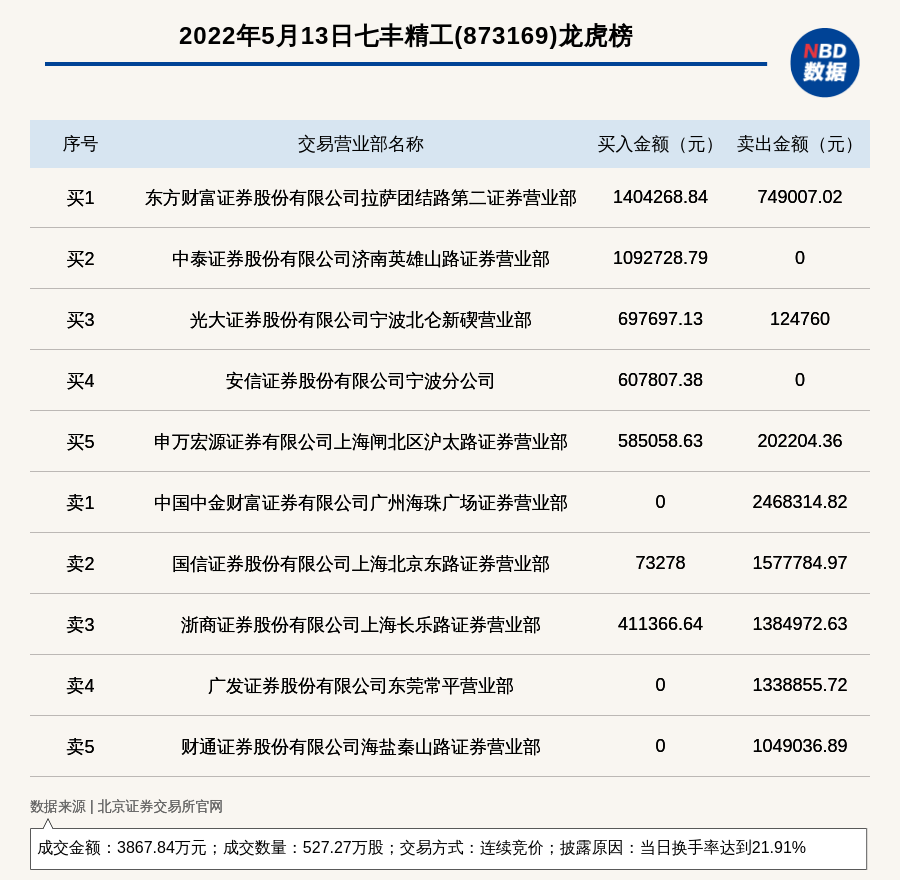 每经讯,2022年5月13日,北交所上市公司七丰精工(873169)登上龙虎榜,交易方式是连续竞价,披露原因是当日换手率达到21.91%,成交数量527.27万股,成交金额3867.84万元。买一席位为东方财富证券股份有限公司拉萨团结路第二证券营业部,买入140.43万元;卖一席位为中国中金财富证券有限公司广州海珠广场证券营业部,卖出246.83万元。