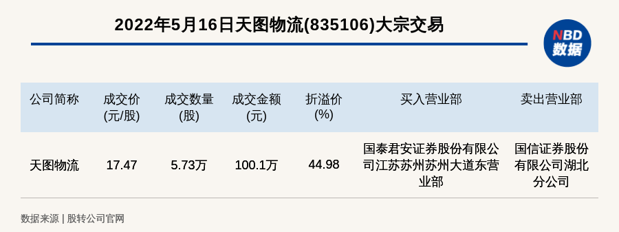 每经讯,2022年5月16日,新三板基础层公司天图物流(835106)发生一笔大宗交易,成交价17.47元/股,成交数量5.73万股,成交金额100.1万元,溢价44.98%。