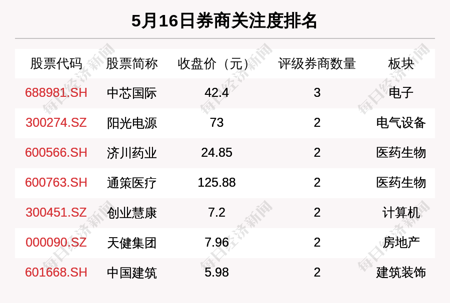 从券商对个股的关注程度来看,有7只个股获得多家券商关注,券商关注数量排名居前的个股是中芯国际(688981.SH)、阳光电源(300274.SZ)、济川药业(600566.SH)。