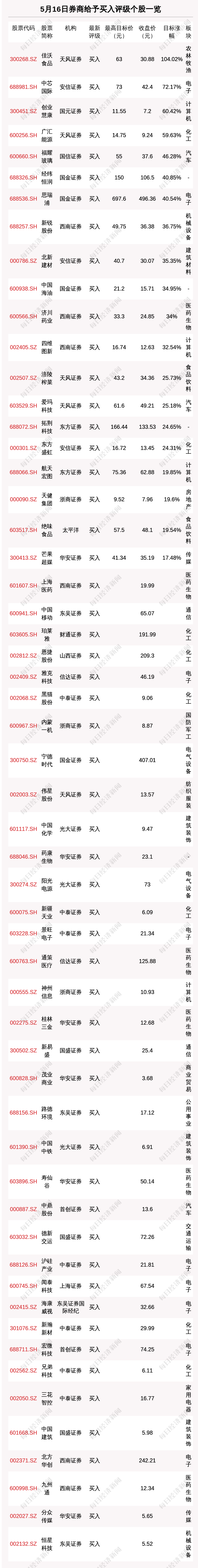 每经AI快讯,5月16日,券商给予评级的个股数共有89只,获得买入评级的个股数共有56只。在公布了目标价格的20只个股中,按照最新收盘价计算,预期涨幅排名居前的个股是佳沃食品(300268.SZ)、中芯国际(688981.SH)、创业慧康(300451.SZ),预期涨幅分别是104.02%、72.17%、60.42%。