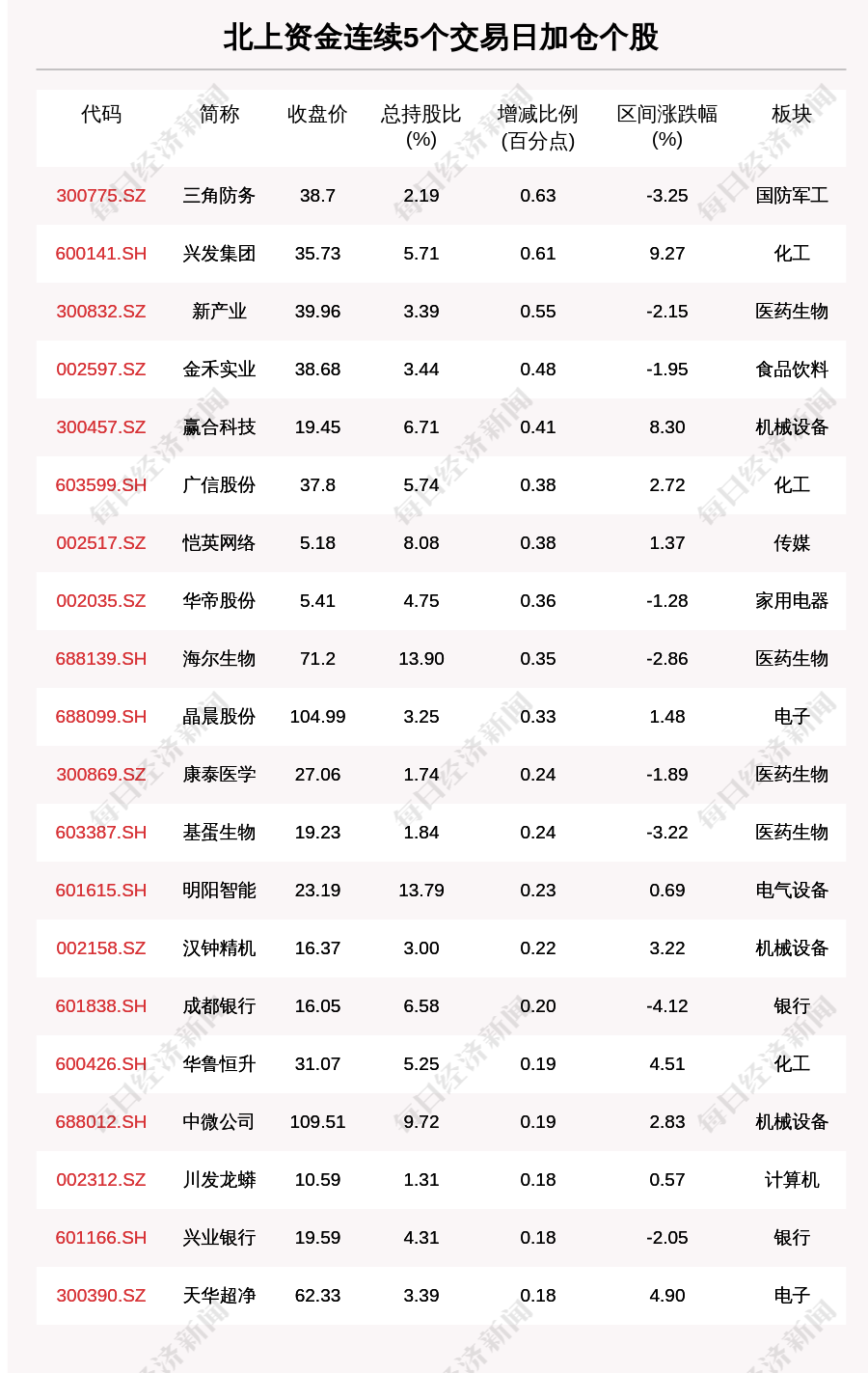每经AI快讯,5月17日,北上资金连续5个交易日买入52个股。北上资金连续5个交易日加仓个股中,三角防务(300775.SZ,收盘价:38.7元)增持比例增幅最大,5个交易日增持0.63个百分点,其他增持比例较大的个股包括兴发集团(600141.SH,收盘价:35.73元)、新产业(300832.SZ,收盘价:39.96元)、金禾实业(002597.SZ,收盘价:38.68元),分别增持0.61个百分点、0.55个百分点、0.48个百分点。