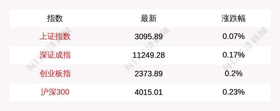 每经AI快讯:北京时间5月18日9:30,上证指数开盘上涨2.19点,涨幅为0.07%,报3095.89点;深证成指开盘上涨19.12点,涨幅为0.17%,报11249.28点;创业板指开盘上涨4.8点,涨幅为0.2%,报2373.89点;沪深300开盘上涨9.12点,涨幅为0.23%,报4015.01点。