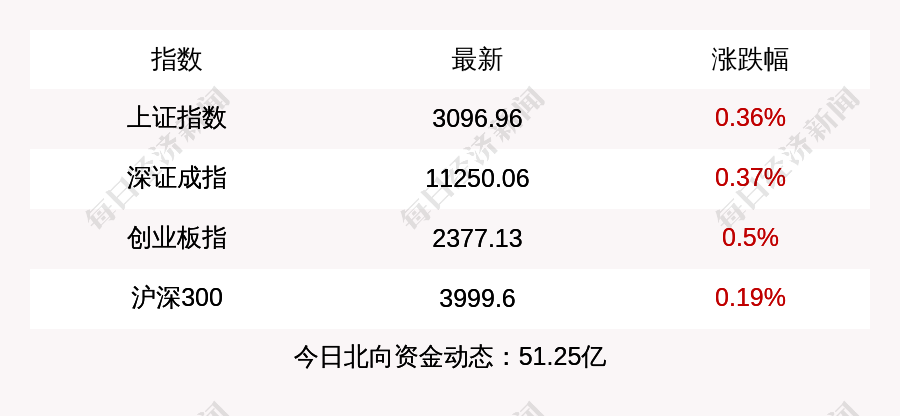 每经AI快讯:北京时间5月19日15:00,上证指数收盘上涨10.98点,涨幅为0.36%,报收3096.96点,成交额3600.18亿元;深证成指收盘上涨41.98点,涨幅为0.37%,报收11250.06点,成交额4466.88亿元;创业板指收盘上涨11.75点,涨幅为0.5%,报收2377.13点,成交额1467.53亿元;沪深300收盘上涨7.69点,涨幅为0.19%,报收3999.6点,成交额2102.07亿元。北上资金当日净流入51.25亿元。