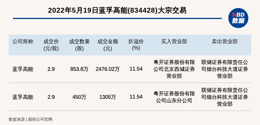 每经讯,2022年5月19日,新三板基础层公司蓝孚高能(834428)发生2笔大宗交易,总成交金额为3781.02万元,成交金额最高的一笔成交价2.9元/股,成交数量853.8万股,成交金额2476.02万元,溢价11.54%。买入营业部是粤开证券股份有限公司北京西城证券营业部,卖出营业部是联储证券有限责任公司烟台科技大道证券营业部。