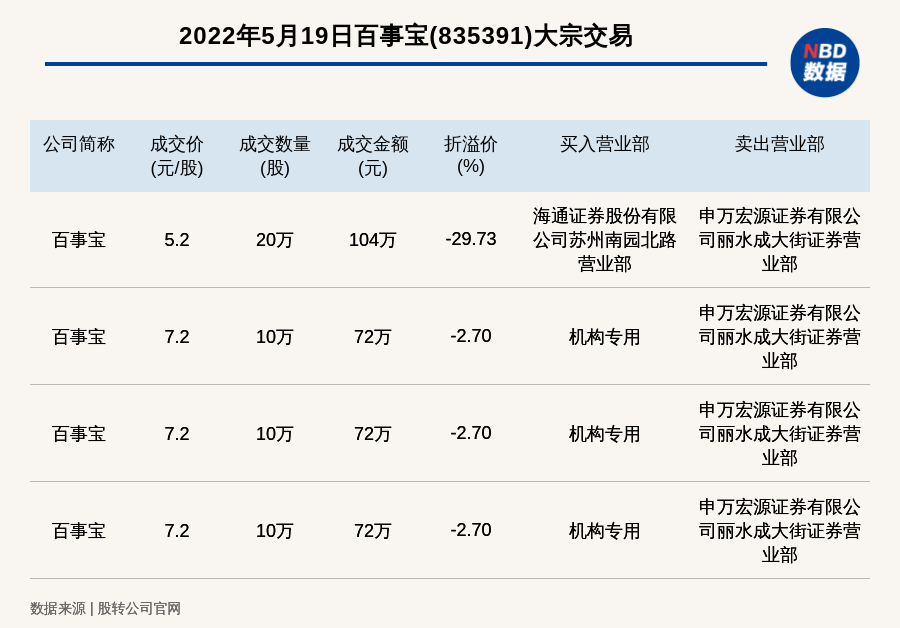 每经讯,2022年5月19日,新三板创新层公司百事宝(835391)发生4笔大宗交易,折价率最高的一笔成交价5.2元/股,成交数量20万股,成交金额104万元,折价29.73%。买入营业部是海通证券股份有限公司苏州南园北路营业部,卖出营业部是申万宏源证券有限公司丽水成大街证券营业部。