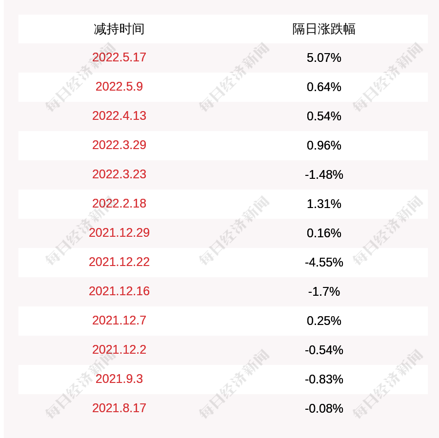 2. 锦盛新材上次发布减持公告是2022年05月17日,第二个交易日上涨5.07%,锦盛新材近一年共发布14次减持类公告。