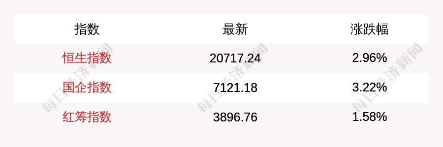 每经AI快讯:北京时间5月20日16:00,恒生指数收盘上涨596.56点,涨幅为2.96%,报收20717.24点;国企指数收盘上涨221.99点,涨幅为3.22%,报收7121.18点;红筹指数收盘上涨60.66点,涨幅为1.58%,报收3896.76点。南向资金当日净流入2.22亿港元。