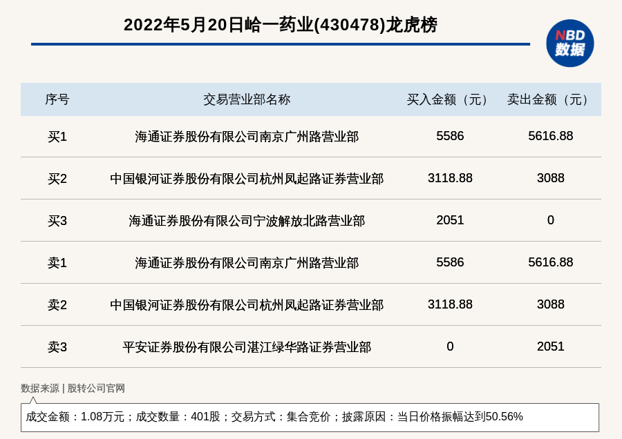 每经讯,2022年5月20日,新三板基础层公司峆一药业(430478)登上龙虎榜,交易方式是集合竞价,披露原因是当日价格振幅达到50.56%,成交数量401股,成交金额1.08万元。买一席位为海通证券股份有限公司南京广州路营业部,买入5586元;卖一席位为海通证券股份有限公司南京广州路营业部,卖出5616.88元。
