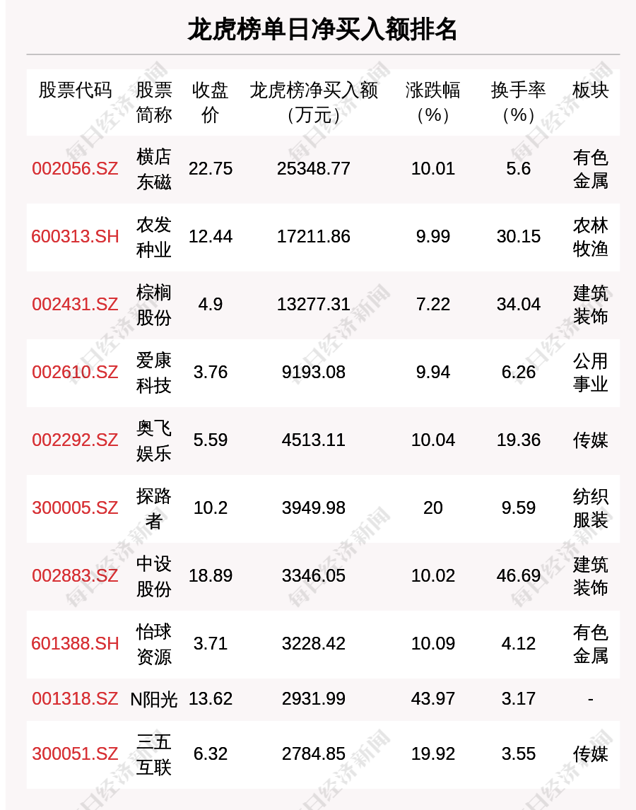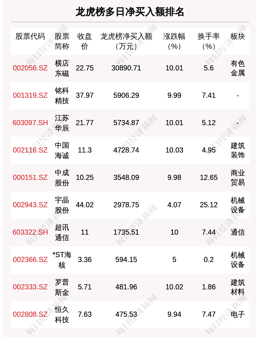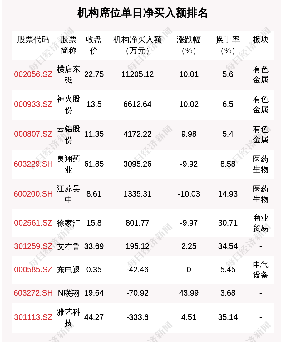 在龙虎榜中,涉及机构专用席位的个股有17只,净买入额前三的是横店东磁、神火股份、云铝股份,分别为1.12亿元、6612.64万元、4172.22万元。
