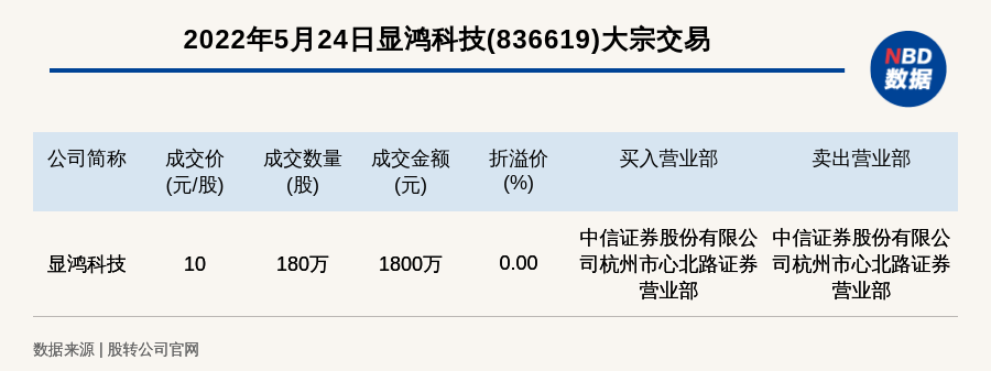 每经讯,2022年5月24日,新三板创新层公司显鸿科技(836619)发生一笔大宗交易,成交价10元/股,成交数量180万股,成交金额1800万元,为平价交易。买入营业部是中信证券股份有限公司杭州市心北路证券营业部,卖出营业部是中信证券股份有限公司杭州市心北路证券营业部。