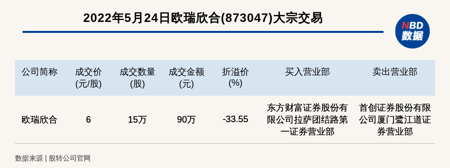 每经讯,2022年5月24日,新三板创新层公司欧瑞欣合(873047)发生一笔大宗交易,成交价6元/股,成交数量15万股,成交金额90万元,折价33.55%。买入营业部是东方财富证券股份有限公司拉萨团结路第一证券营业部,卖出营业部是首创证券股份有限公司厦门鹭江道证券营业部。
