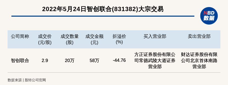 每经讯,2022年5月24日,新三板基础层公司智创联合(831382)发生一笔大宗交易,成交价2.9元/股,成交数量20万股,成交金额58万元,折价44.76%。买入营业部是方正证券股份有限公司常德武陵大道证券营业部,卖出营业部是财达证券股份有限公司北京首体南路营业部。
