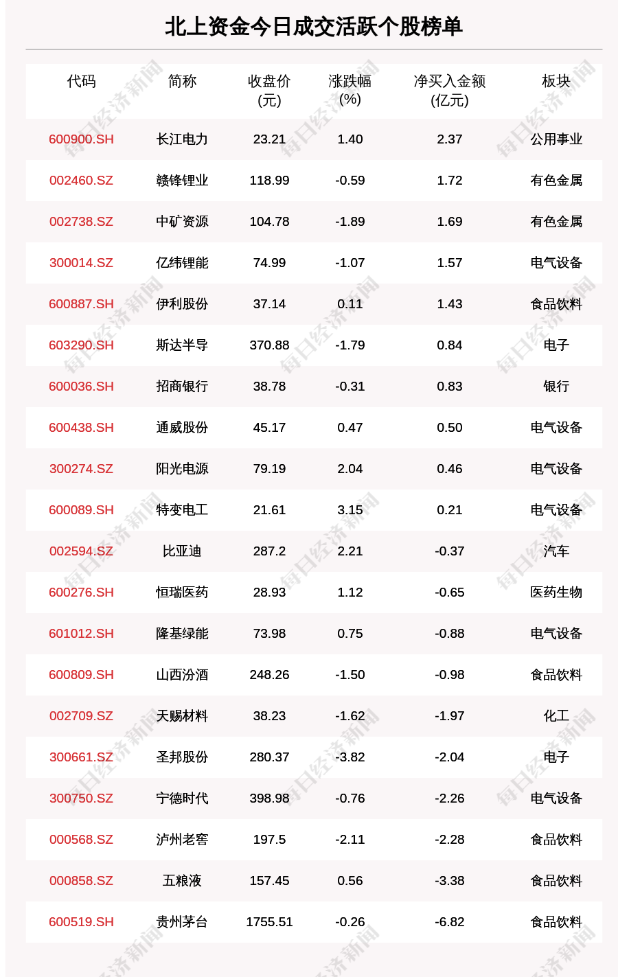 5月25日,北上资金成交活跃个股榜单中,净买入个股共10只,金额最多的是长江电力(600900.SH,收盘价:23.21元),净买入2.366亿元;净卖出个股共10只,金额最多的是贵州茅台(600519.SH,收盘价:1755.51元),净卖出6.819亿元。