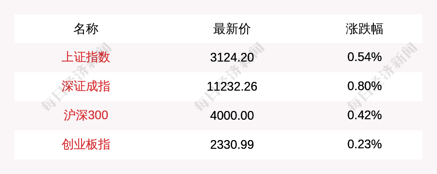 截至北京时间13:30,上证指数报3124.20点,涨0.54%,深证成指报11232.26点,涨0.80%,沪深300报4000.00点,涨0.42%,创业板指报2330.99点,涨0.23%